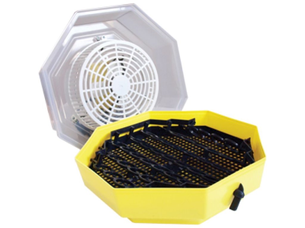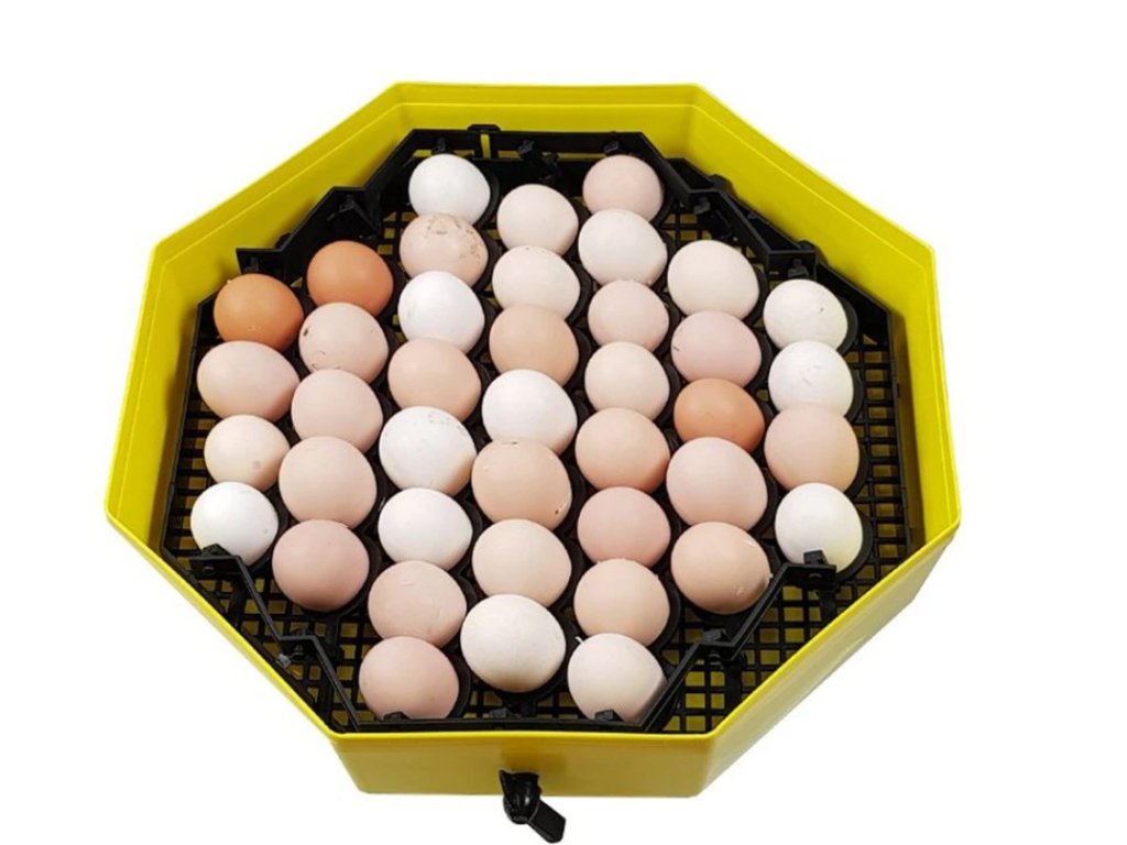 Díky otočnému roštu lze jednoduše otáčet až 41 slepičími nebo kachními vejci pomocí páčky – ideálně dvakrát denně, ráno a večer. Líheň využívá praktický systém poloautomatického otáčení vajec, který umožňuje snadnou manipulaci bez nutnosti otevírat víko. Pohybem páčky z vnější strany se otáčejí všechna vejce v roštu najednou, což zajišťuje rovnoměrný vývoj zárodků a eliminuje riziko poškození skořápky. Bez otočného roštu pojme líheň až 60 slepičích, 120 křepelčích, 30 husích, 50 kachních nebo 70 bažantích vajec.