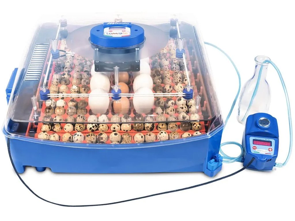 vhodná k líhnutí vodní a hrabavé drůbeže - pro kuřata, křepelky, kachny, krůty, husy, ale i exotické ptactvo. S automatickým otáčením až 56ks vajec - možnost i ručního otáčení vajec, s digitální regulací teploty od 30 do 40°C, s digitální regulací vlhkosti - automatický zvlhčovač vzduchu SIRIO, s nádržkou na přívod vody, s teploměrem, s vlhkoměrem a s 12V autoadaptérem pro případný výpadek proudu.