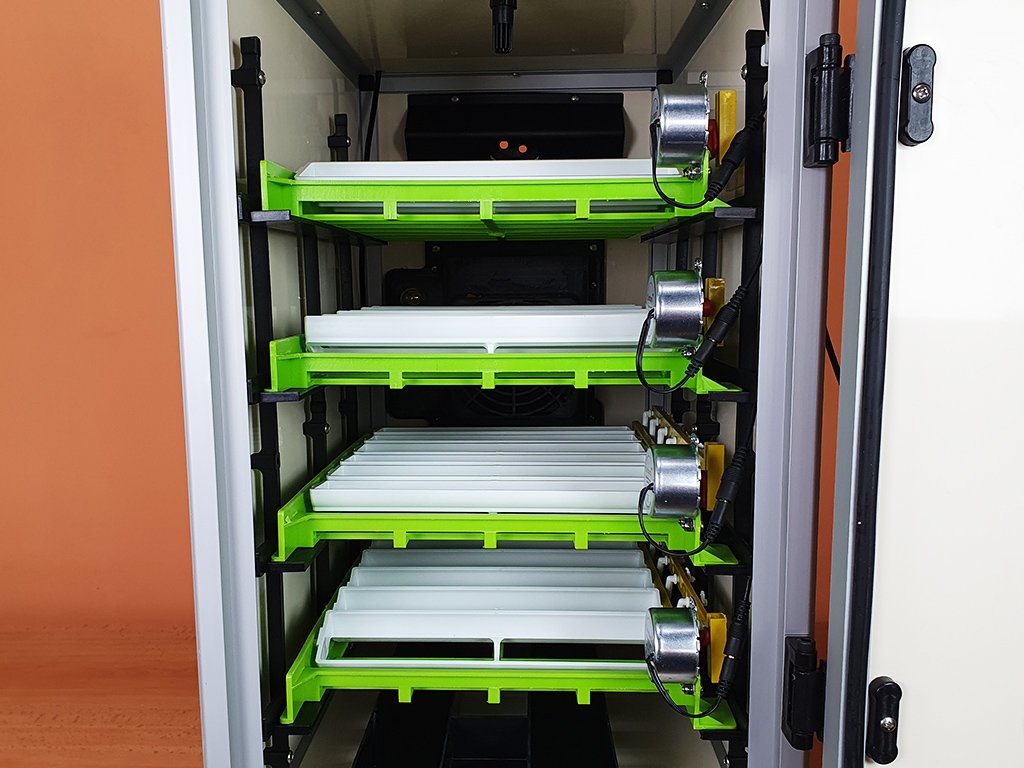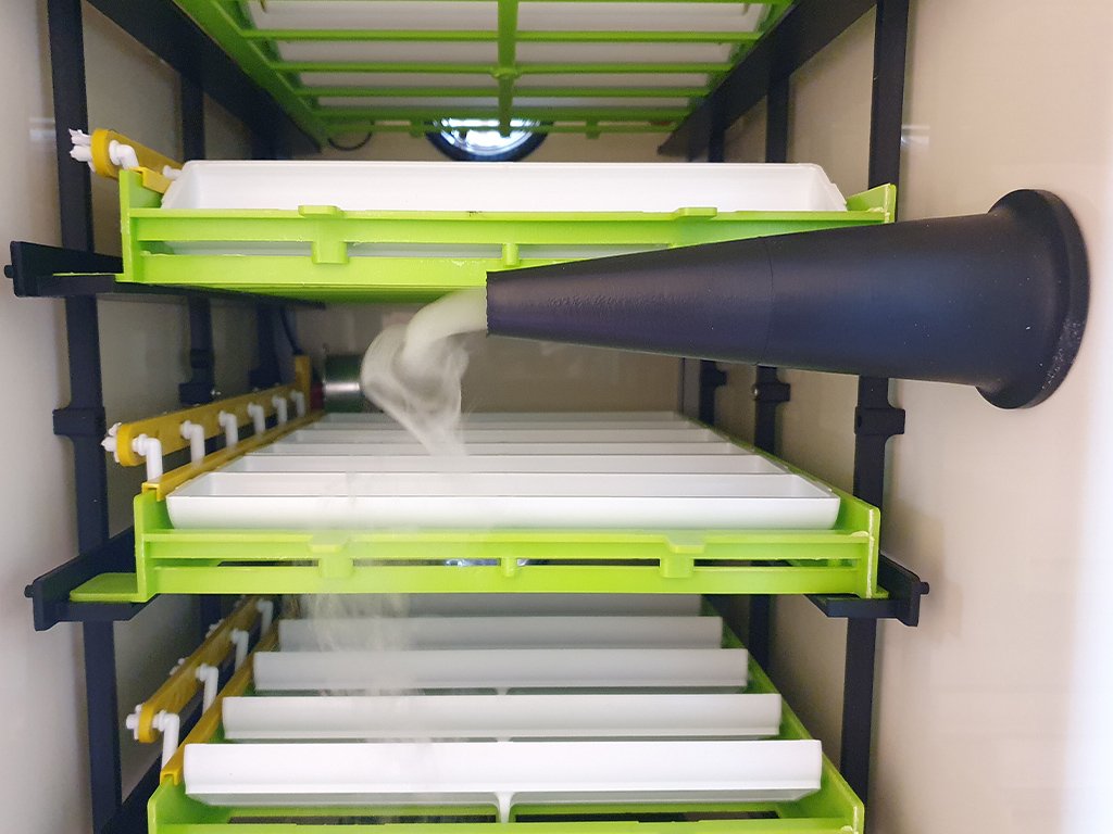 U drůbeže, kde je potřeba v průběhu líhnutí ochlazovat a následně rosit vejce, využijete funkci aktivního periodického chlazení, které automaticky dle nastavení dokáže snížit v pravidelných intervalech teplotu i vlhkost na nízké hodnoty, a tím ochladit vejce a simulovat chování drůbeže, která během líhnutí na určitou dobu opouští hnízdo, aby se napila a nasytila. Na konci fáze ochlazování si líheň automaticky zvýší vlhkost, aby simulovala rosení vajec, ke kterému dochází v přírodě tak, že se drůbež během přestávky namáčí a následně takto mokrá nasedá zpět na vejce.