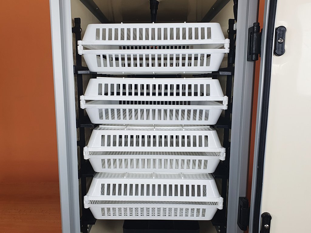 vhodná k líhnutí vodní a hrabavé drůbeže - pro kuřata, křepelky, kachny, krůty, husy a bažanty. S automatickým otáčením (4ks otočných roštů v balení) až 120ks slepičích vajec - možnost i ručního otáčení vajec (4ks košíků na dolíhnutí v balení), s alarmem teploty a vlhkosti, s regulací teploty od 36,6 do 38,3°C, s automatickou regulací vlhkosti, s teploměrem a s vlhkoměrem.