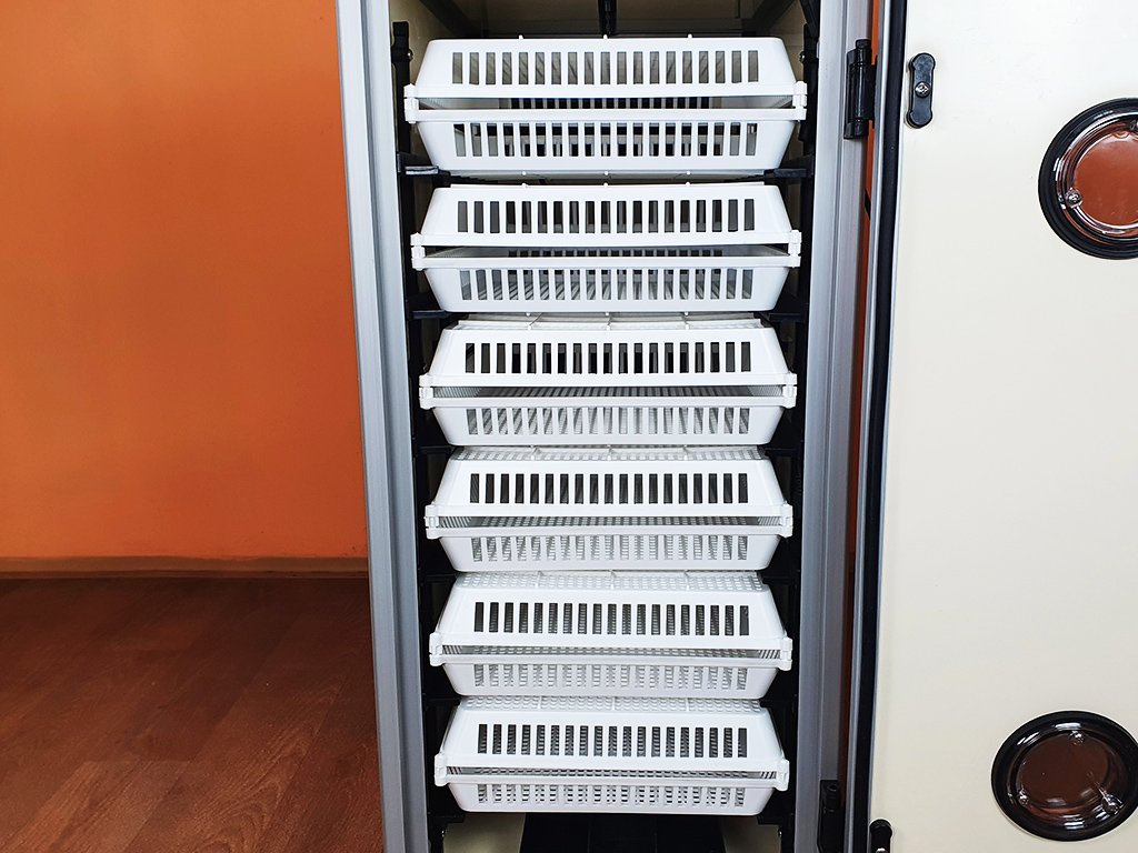 vhodná k líhnutí vodní a hrabavé drůbeže - pro kuřata, křepelky, kachny, krůty, husy a bažanty. S automatickým otáčením (6ks otočných roštů v balení) až 180ks slepičích vajec - možnost i ručního otáčení vajec (6ks košíků na dolíhnutí v balení), s alarmem teploty a vlhkosti, s regulací teploty od 36,6 do 38,3°C, s automatickou regulací vlhkosti, s teploměrem a s vlhkoměrem.