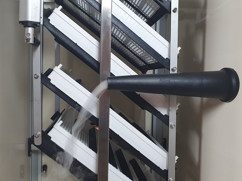 Otáčení vajec v líhni je zajištěno pomocí automatického systému pro otáčení vajec TurnX. Pomocí tohoto systému jsou vejce pravidelně a velmi jemně otáčena v 1 hodinových intervalech. Systém TurnX je vyroben z chromové oceli a je velmi jednoduchý na údržbu. Motor systému je napájen pomocí samostatného adaptéru s velmi nízkou spotřebou. Součástí balení jsou univerzální rošty na různé druhy vajec. V těchto roštech je možné líhnout různé velikosti vajec (od křepelčích až po husí vejce), které se umísťují do roštu a upevní se za pomoci dělících lišt, které jsou samozřejmě součástí balení - ke každému roštu je v balení 10ks dělících lišt.