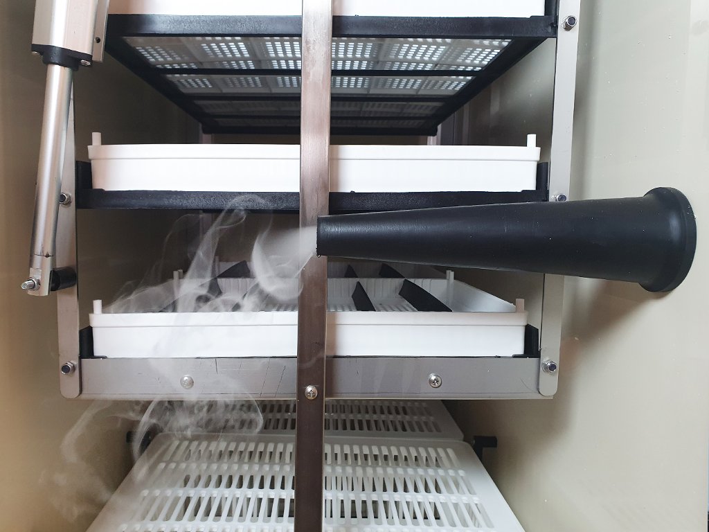 U drůbeže, kde je potřeba v průběhu líhnutí ochlazovat a následně rosit vejce, využijete funkci aktivního periodického chlazení, které automaticky dle nastavení dokáže snížit v pravidelných intervalech teplotu i vlhkost na nízké hodnoty, a tím ochladit vejce a simulovat chování drůbeže, která během líhnutí na určitou dobu opouští hnízdo, aby se napila a nasytila. Na konci fáze ochlazování si líheň automaticky zvýší vlhkost, aby simulovala rosení vajec, ke kterému dochází v přírodě tak, že se drůbež během přestávky namáčí a následně takto mokrá nasedá zpět na vejce.