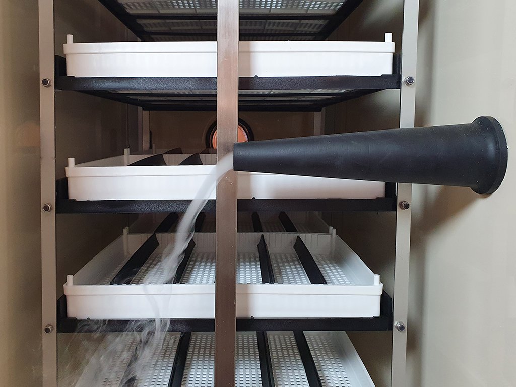 U drůbeže, kde je potřeba v průběhu líhnutí ochlazovat a následně rosit vejce, využijete funkci aktivního periodického chlazení, které automaticky dle nastavení dokáže snížit v pravidelných intervalech teplotu i vlhkost na nízké hodnoty, a tím ochladit vejce a simulovat chování drůbeže, která během líhnutí na určitou dobu opouští hnízdo, aby se napila a nasytila. Na konci fáze ochlazování si líheň automaticky zvýší vlhkost, aby simulovala rosení vajec, ke kterému dochází v přírodě tak, že se drůbež během přestávky namáčí a následně takto mokrá nasedá zpět na vejce.