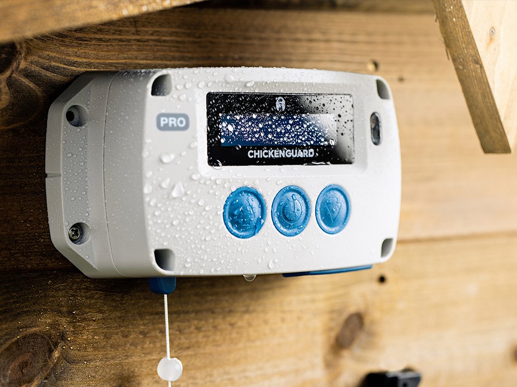 Chicken Guard Pro má velmi výkonný motor, který dokáže zvednout až 2 kg. Součástí zařízení je i bezkontaktní snímač polohy dvířek. Přístroj je vybaven velmi odolným pouzdrem, a tak zajišťuje perfektní ochranu při extrémních povětrnostních podmínkách až do teploty -20 °C. Všechny potřebné informace o nastavení jsou přehledně znázorněny na dvouřádkovém LCD displeji. LCD displej přejde po určité době nečinnosti do "režimu spánku", aby se zvýšila životnost displeje. Zařízení znovu "probudíte" stisknutím tlačítka MENU. Pro nastavování programů slouží extra velká tlačítka, aby bylo možné je ovládat i v rukavicích.
