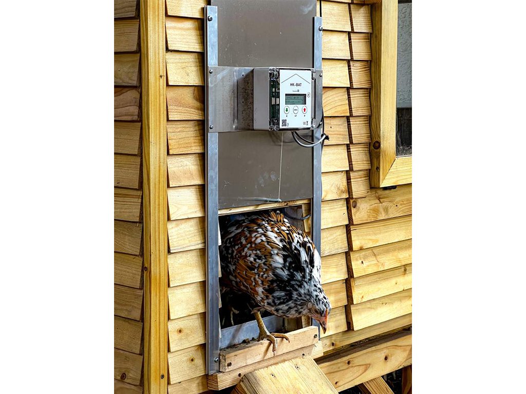 Automatické otevírání a zavírání kurníku JOSTechnik HK-Bat s rámem a bezpečnostními dvířky s rozměry 30 x 45 cm. Jedná se o kompletní automatický systém ovládání pohybu dvířek se světelným senzorem, časovačem a funkcí nouzového otevírání dvířek. Integrovaný LCD displej zajišťuje snadné nastavení a změnu časování v případě potřeby. Vhodný až do teploty -30°C.