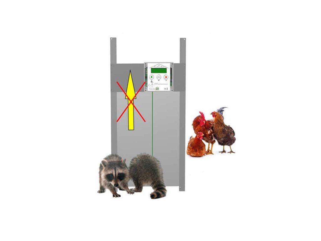 - Funkce nouzového otevření dvířek - dvířka jsou vybavena speciální ochrannou funkcí, která reaguje na situaci, pokud se během uzavírání dvířek pod nimi nachází jakékoliv zvíře. Jakmile dvířkům brání cokoliv v cestě, motor se automaticky zastaví a dvířka se ihned opět otevřou. Uzavírání se takto několikrát automaticky opakuje, dokud dvířkům v cestě nic nebrání. Tento unikátní systém zajišťuje absolutní bezpečí a není možné, aby drůbež dvířka jakkoliv zranila.