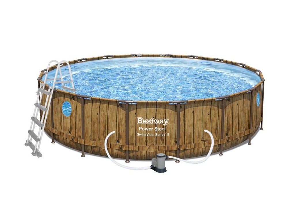 Nadzemní bazén s konstrukcí POWER STEEL WOOD SWIM VISTA pro povrchovou montáž je vyroben z trojvrstvého PVC, má čtyři zabudované průhledy (vodotěsné okno), Seal & Lock System™ zajišťuje pevné spojení trubek korizi odolné konstrukce. Vnější potisk s imitací dřevěných prken, dno imitace mozaiky, vypouštěcí ventil. Stačí pouze sestavit konstrukci, napustit vodou a bazén je připraven ke koupání. Díky pružné a bezpečné konstrukci je bazén vhodný pro rodiny s dětmi.