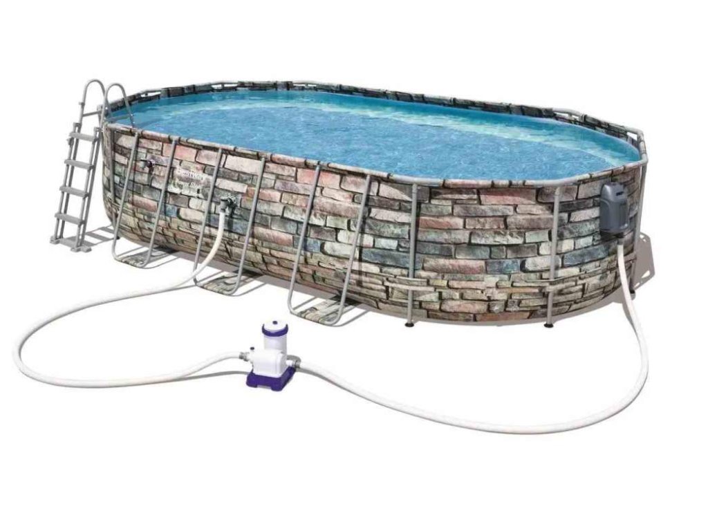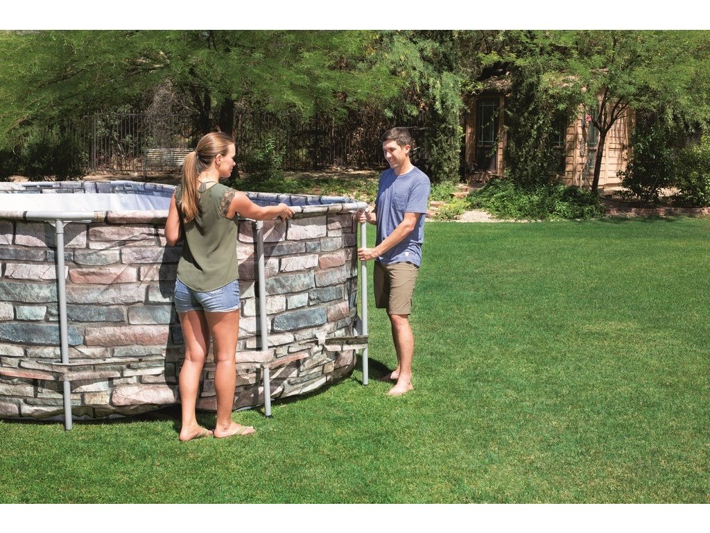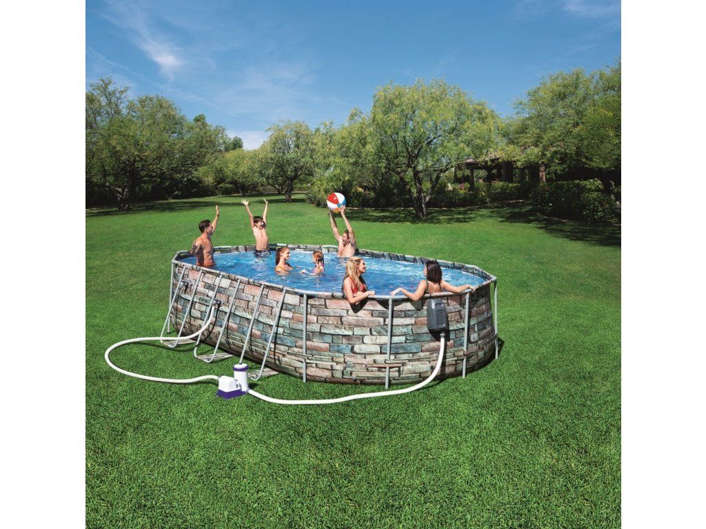 Nadzemní oválné rodinné bazény z trojvrstvého vinylu TriTech™ a zesílené kovové konstrukce Power Steel™ s pevným dnem, patří díky své jednoduché a rychlé montáži mezi nejprodávanější na trhu. Sestavení obvykle trvá 2-3 lidem 1 hodinu. Stačí pouze sestavit konstrukci a napustit vodou.