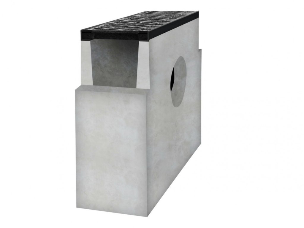 Betonová vpusť kompatibilní s spádovým betonovým žlabem B125 . Odtok sběrné vpusti je řešen připojením trubky do boků šachty.