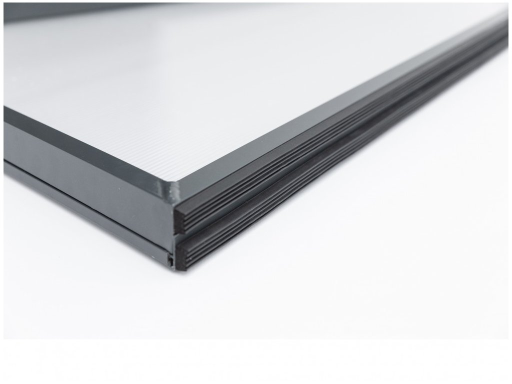 Boční stěna je vyrobená z práškově lakovaného hliníku světle šedé barvy RAL 7035. Hliníková konstrukce perfektně odolává vlivům počasí, i po letech je pevná a stabilní. V zimě mrazem nekřehne a ani na silném letním slunci nedochází ke změnám barvy. Stěna je zasklená bronzovým komůrkovým polykarbonátem síly 6 mm s oboustranným UV filtrem.