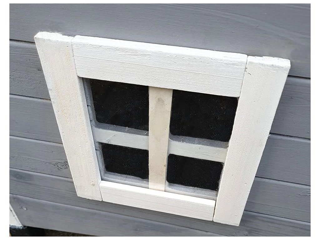 Bouda je vybavena výškově nastavitelnými plastovými nožkami, které umožňují stabilní postavení i na nerovném povrchu a chrání dno před vlhkostí. Praktická odklopná dvířka s průhlednými lamelami zajišťují ochranu před větrem a chladem, zatímco malé plexi okénko propouští dostatek světla dovnitř.