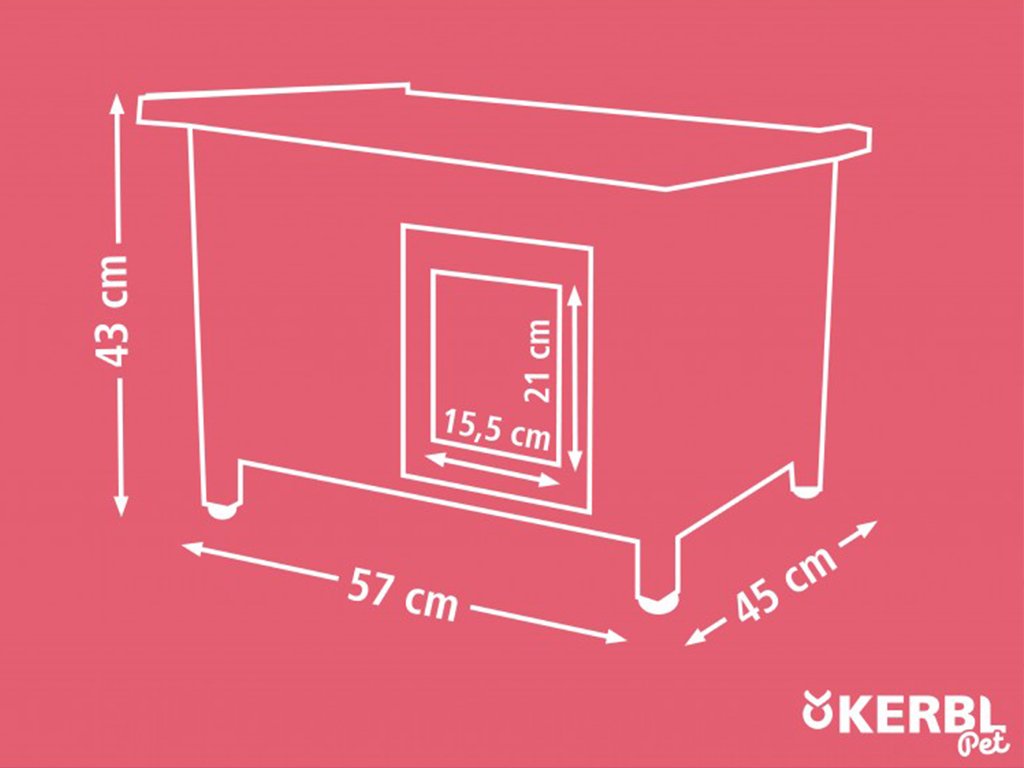 Vnější rozměry celého domečku pro kočky jsou 57 x 45 x 43 cm. Rozměry podlahy jsou 50,5 x 33,5 cm. Rozměry dvířek jsou 15,5 x 21 cm. Tloušťka stěn je 1 cm.