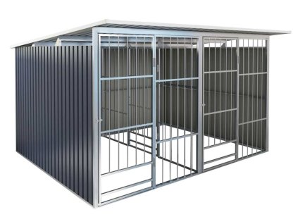Bouda pro psa z lakovaného dřeva v šedo-bílé barvě, bitumenová střecha, lamelový závěs...