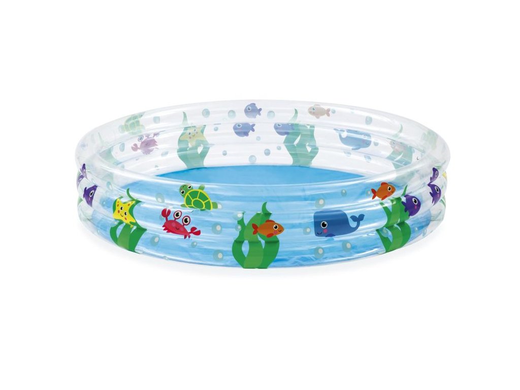 Dětský nafukovací bazén s potiskem mořského světa. Bazén má tři samostatně nafukovací prstence, které jsou zabezpečené proti nechtěnému úniku vzduchu. Součástí dodávky je sada na zalepení drobných děr. Pro rychlé a snadné sestavení doporučujeme k dětskému bazénku zakoupit nožní pumpu.