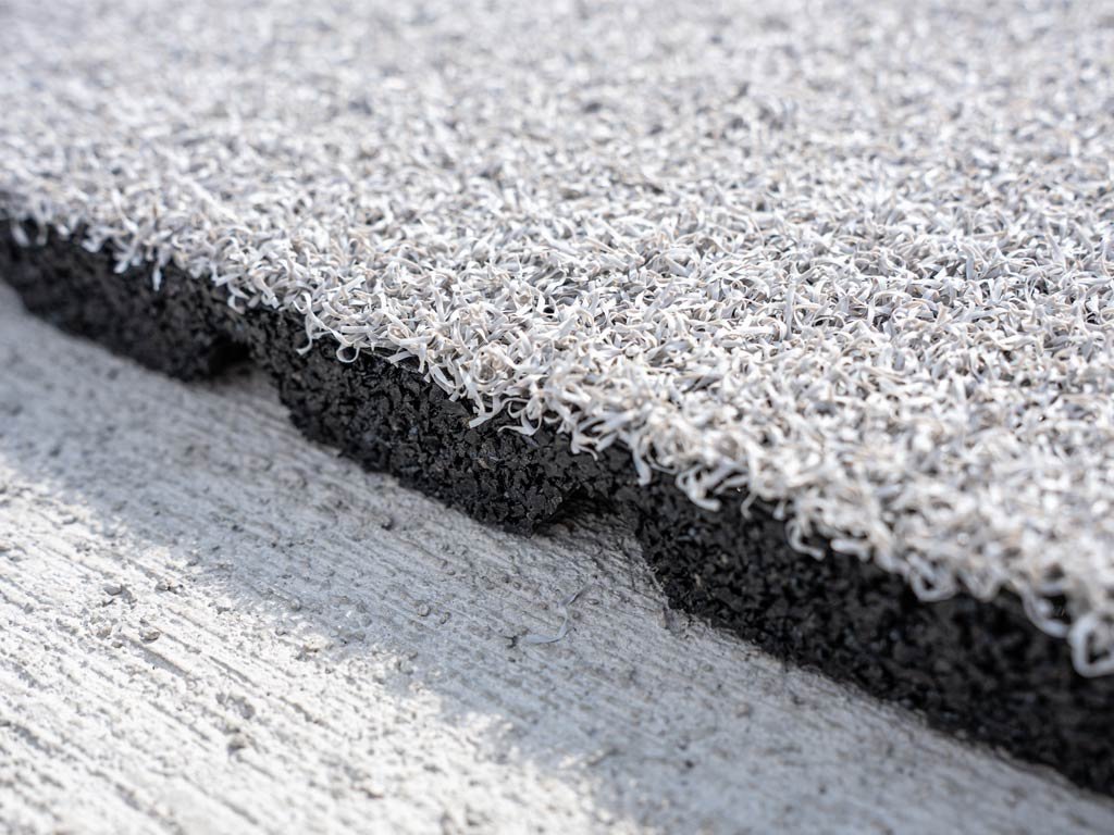- Kombinace umělého trávníku a gumové dlaždice pro odolný a estetický povrch