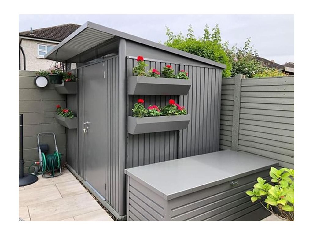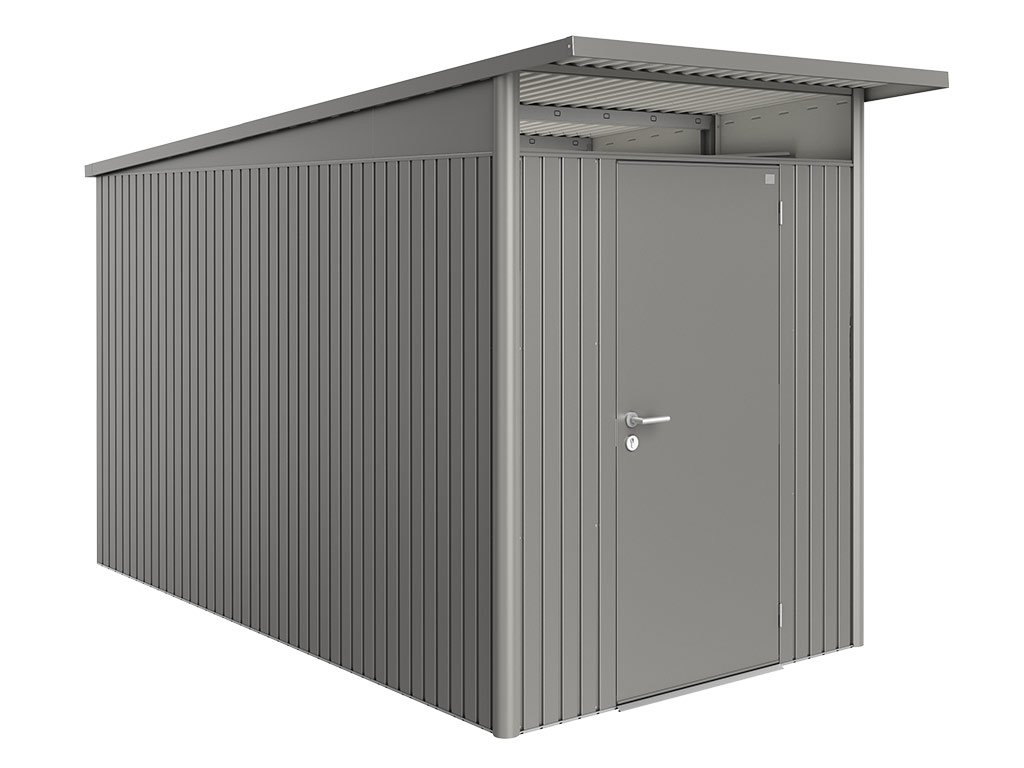 Nemáte kam uskladnit jízdní kola, potřeby k bazénu, zahradní sekačku s nářadím a další věci, které se nevejdou do domu, ale chcete je mít pod střechou a bezpečně pod zámkem? Pořiďte si stylový kovový domek na nářadí AvantGarde A4 prémiové kvality s pultovou střechou, který vyhovuje i nárokům moderní architektury. Domek je široký 180 cm (přední strana s dveřmi) a 380 cm dlouhý(včetně přesahu střechy). Domky AvantGarde nabízíme ve třech barevných provedeních a osmi velikostech.