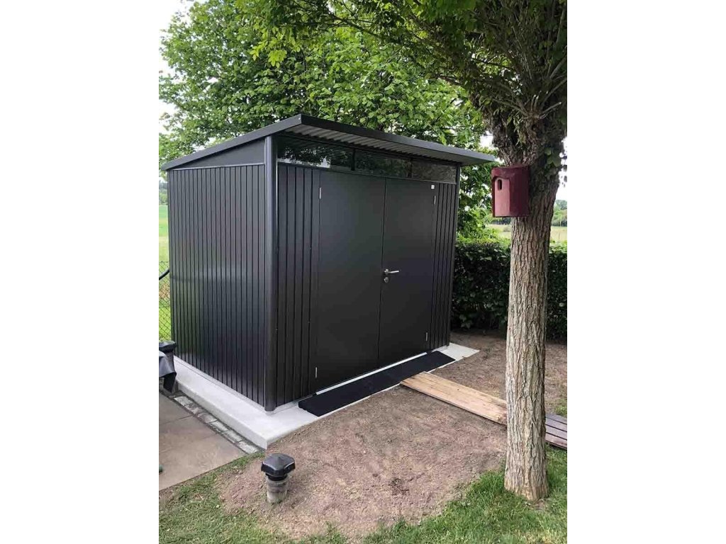 Nemáte kam uskladnit jízdní kola, potřeby k bazénu, zahradní sekačku s nářadím a další věci, které se nevejdou do domu, ale chcete je mít pod střechou a bezpečně pod zámkem? Pořiďte si stylový kovový domek na nářadí AvantGarde A8 prémiové kvality s pultovou střechou, který vyhovuje i nárokům moderní architektury. Domek je široký 260 cm (přední strana s dveřmi) a 380 cm dlouhý(včetně přesahu střechy). Domky AvantGarde nabízíme ve třech barevných provedeních a osmi velikostech.
