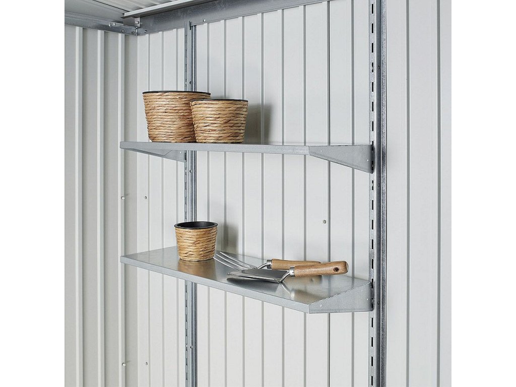 Sada polic a regálových stojen změní váš zahradní domek Biohort na přehledný sklad. Police jsou individuálně polohovatelné. Standardní hloubka je 24,5 cm. Šířka police je 72 cm. Policová sada je žárově pozinkovaná, aby byla zajištěna dlouhá životnost. Snadno se instaluje a vydrží zatížení až 15 kg na polici. Pro všechny, kteří potřebují uložit mnohem více věcí, nabízíme polici s hloubkou 43,5 cm, kterou si můžete dokoupit v bohaté nabídce volitelného příslušenství.