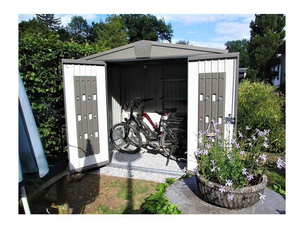 Nemáte kam uskladnit jízdní kola, potřeby k bazénu, zahradní sekačku s nářadím a další věci, které se nevejdou do domu, ale chcete je mít pod střechou a bezpečně pod zámkem? Pořiďte si stylový kovový domek na nářadí Europa 4 prémiové kvality se sedlovou střechou, který vyhovuje i nárokům moderní architektury. Domek je široký 244 cm (přední strana s dveřmi) a 228 cm dlouhý (včetně přesahu střechy). Domky Europa nabízíme ve čtyřech barevných provedeních a devíti velikostech.