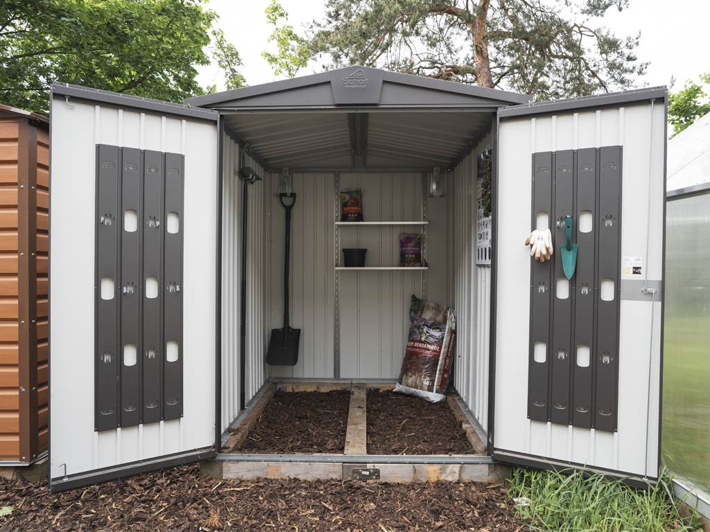 Nemáte kam uskladnit jízdní kola, potřeby k bazénu, zahradní sekačku s nářadím a další věci, které se nevejdou do domu, ale chcete je mít pod střechou a bezpečně pod zámkem? Pořiďte si stylový kovový domek na nářadí Europa 6 prémiové kvality se sedlovou střechou, který vyhovuje i nárokům moderní architektury. Domek je široký 244 cm (přední strana s dveřmi) a 300 cm dlouhý (včetně přesahu střechy). Domky Europa nabízíme ve čtyřech barevných provedeních a devíti velikostech.