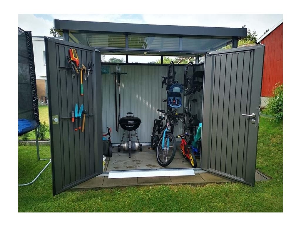 Nemáte kam uskladnit jízdní kola, potřeby k bazénu, zahradní sekačku s nářadím a další věci, které se nevejdou do domu, ale chcete je mít pod střechou a bezpečně pod zámkem? Pořiďte si stylový kovový domek na nářadí HigthLine H1 prémiové kvality s pultovou střechou, který vyhovuje i nárokům moderní architektury. Domek je široký 275 cm (přední strana s dveřmi) a 155 cm dlouhý(včetně přesahu střechy). Domky HighLine nabízíme ve třech barevných provedeních a pěti velikostech.