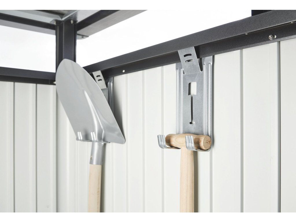 Držák na malé zahradní nářadí namontovaný na vnitřní straně dveří vám zajistí, že máte vždy po ruce přehledně uložené vše, co zrovna potřebujete. Na jedny dveře lze namontovat maximálně 5 držáků nářadí.