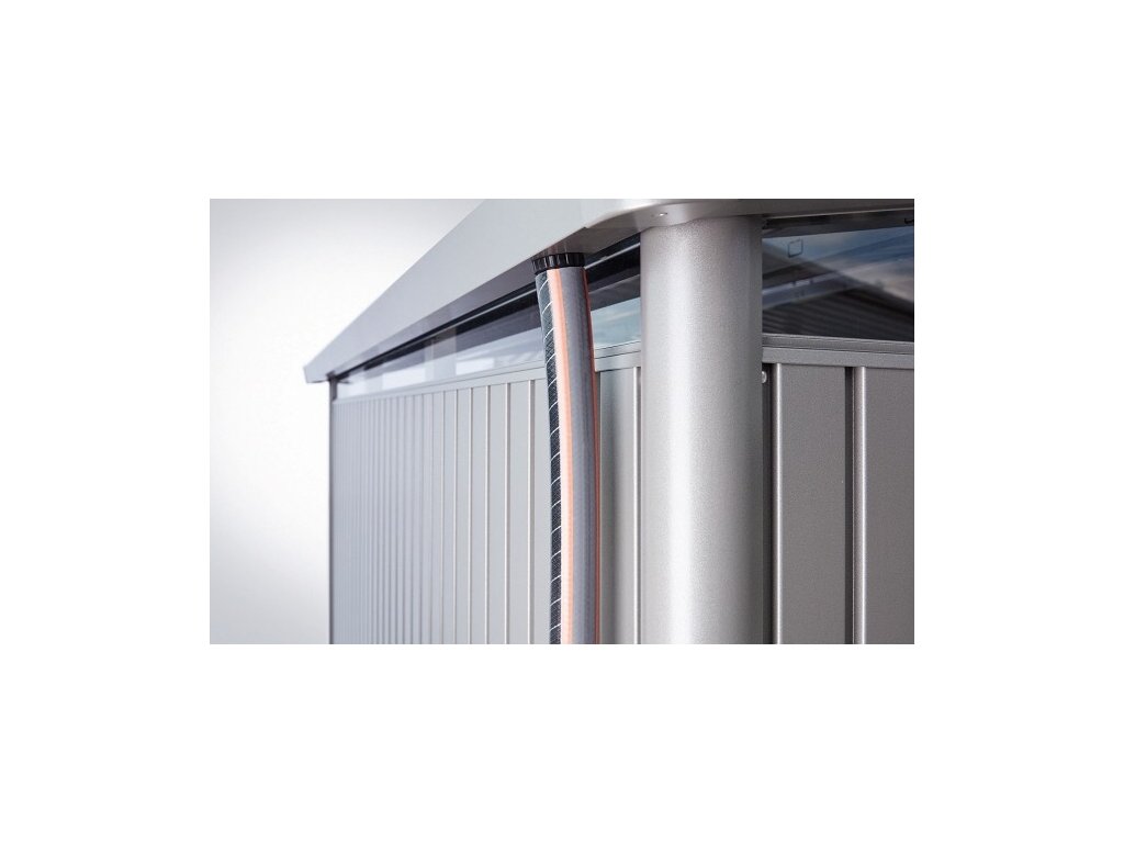 Okapový žlab s integrovaným lapačem listí na obou stranách s připojením na 5/4" hadici pro sběr a odvádění dešťové vody. Sada dešťových svodů s výtokovým kolenem je k dispozici jako volitelné příslušenství.