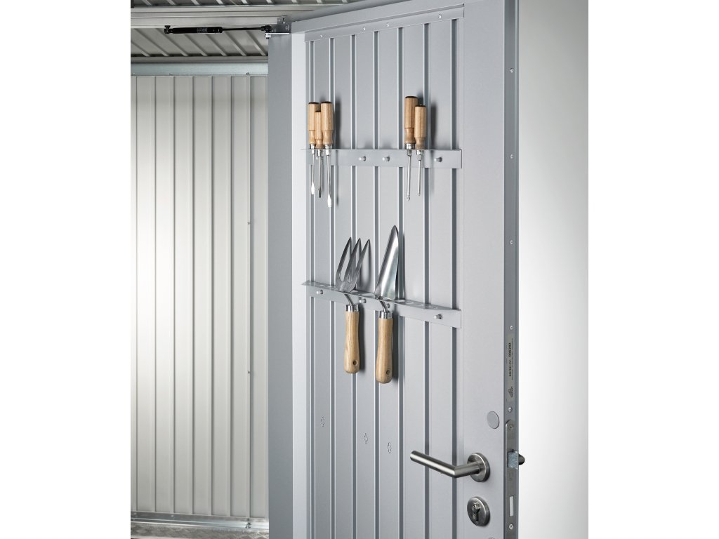 Držák na malé zahradní nářadí namontovaný na vnitřní straně dveří vám zajistí, že máte vždy po ruce přehledně uložené vše, co zrovna potřebujete. Na jedny dveře lze namontovat maximálně 5 držáků nářadí.