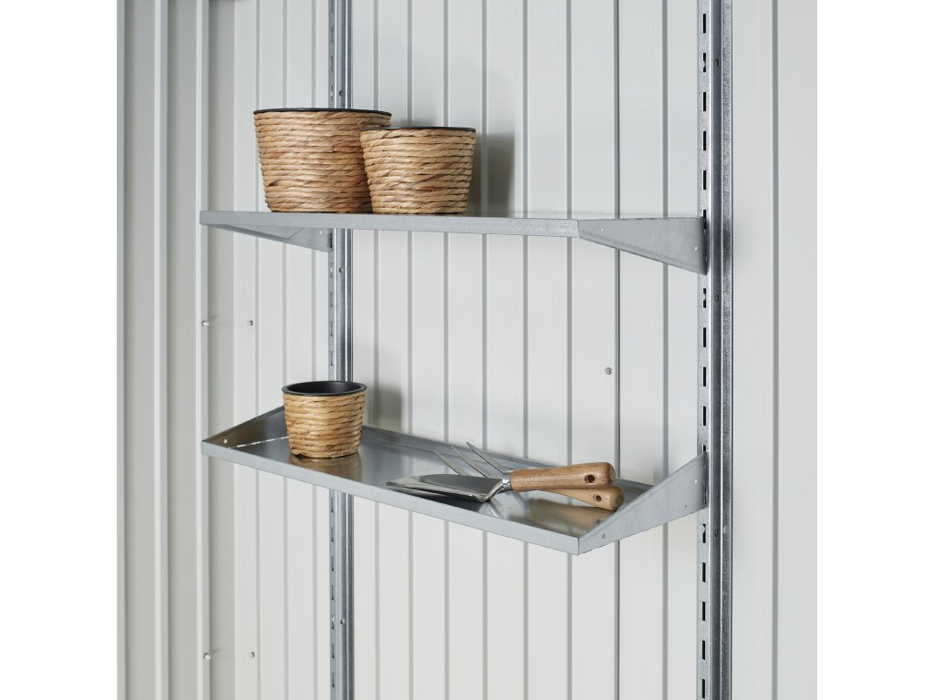 Sada polic a regálových stojen změní váš zahradní domek Biohort na přehledný sklad. Police jsou individuálně polohovatelné. Standardní hloubka je 24,5 cm. Šířka police je 72 cm. Policová sada je žárově pozinkovaná, aby byla zajištěna dlouhá životnost. Snadno se instaluje a vydrží zatížení až 15 kg na polici. Pro všechny, kteří potřebují uložit mnohem více věcí, nabízíme polici s hloubkou 43,5 cm, kterou si můžete dokoupit v bohaté nabídce volitelného příslušenství.