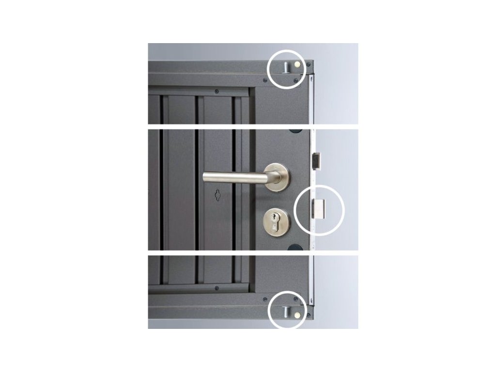 Sada nerezové kliky se standardním cylindrickým zámkem s náhradním klíčem a 3 bodovým zajišťovacím mechanismem zabraňuje nežádoucímu vniknutí. Konstrukce dveří je extrémně robustní. Další nedílnou součástí dveří je: