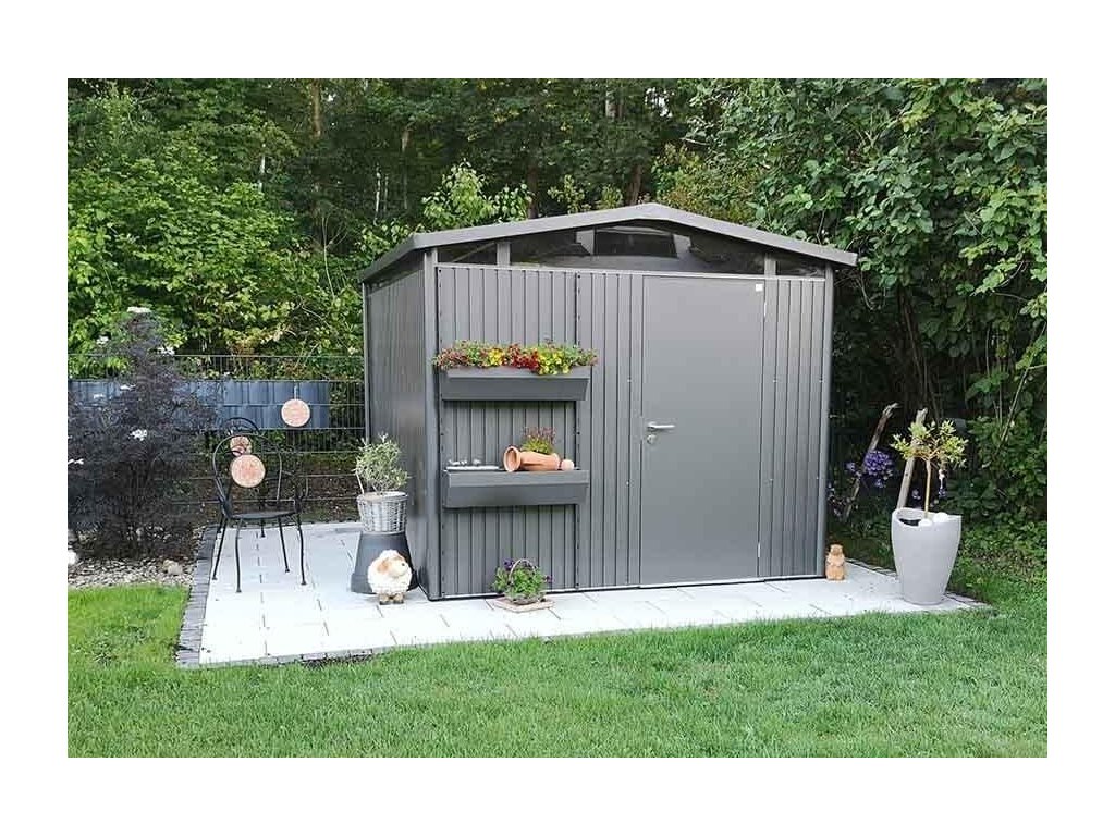 Nemáte kam uskladnit jízdní kola, potřeby k bazénu, zahradní sekačku s nářadím a další věci, které se nevejdou do domu, ale chcete je mít pod střechou a bezpečně pod zámkem? Pořiďte si stylový kovový domek na nářadí Panorama P4 prémiové kvality se sedlovou střechou, který vyhovuje i nárokům moderní architektury. Domek je široký 275 cm (přední strana s dveřmi) a 278 cm dlouhý(včetně přesahu střechy). Domky Panorama nabízíme ve třech barevných provedeních a pěti velikostech.