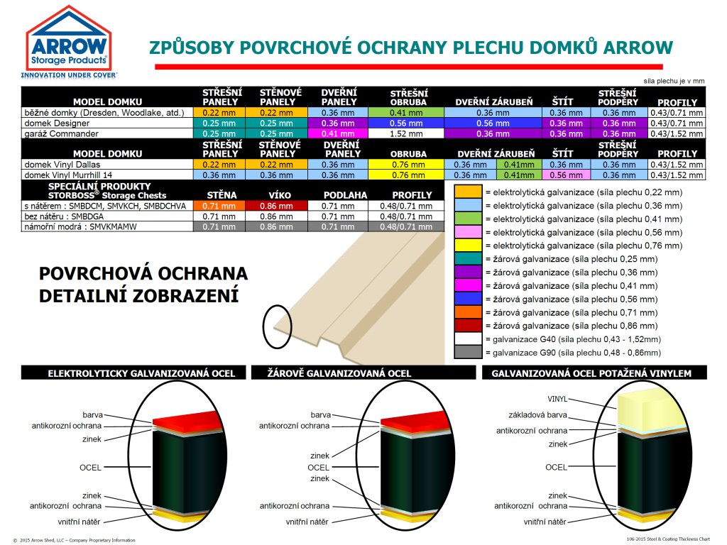 Stěny zahradního domku jsou vyrobeny z kvalitního profilovaného ocelového plechu tloušťky 0,22 - 0,35 mm a konstrukce z pozinkovaného plechu o síle 0,36 - 0,40 mm. Střecha a části podlahové konstrukce jsou žárově pozinkovány, stěny a zbytek konstrukce prošly elektrolytickým zinkováním. Všechny nalakované díly jsou opatřeny kvalitní polyesterovou barvou. Díky tomu je domek odolný vůči nepříznivému počasí a je možné jej používat po celý rok. I proto výrobce poskytuje záruku 10 let proti prorezavění.