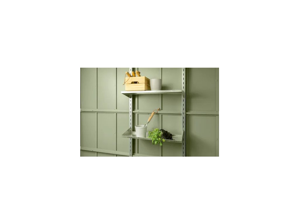 Regálový systém obsahuje 2ks policových desek a krátké regálové držáky, které snadno připevníte. Rozměr polic je 674 x 240 mm. Regál je dokonalým příslušenstvím pro váš zahradní domek Hörmann Classic nebo Modern.