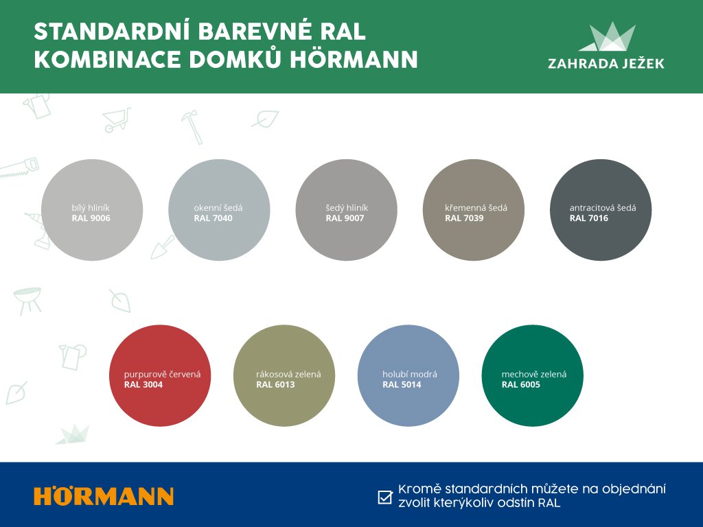 u všech Typů domků můžete vybírat z devíti základních RAL odstínů, případně můžete za příplatek vybrat kterýkoliv jiný RAL odstín tak, aby domek dokonale zapadl do prostředí vašeho domu a zahrady.