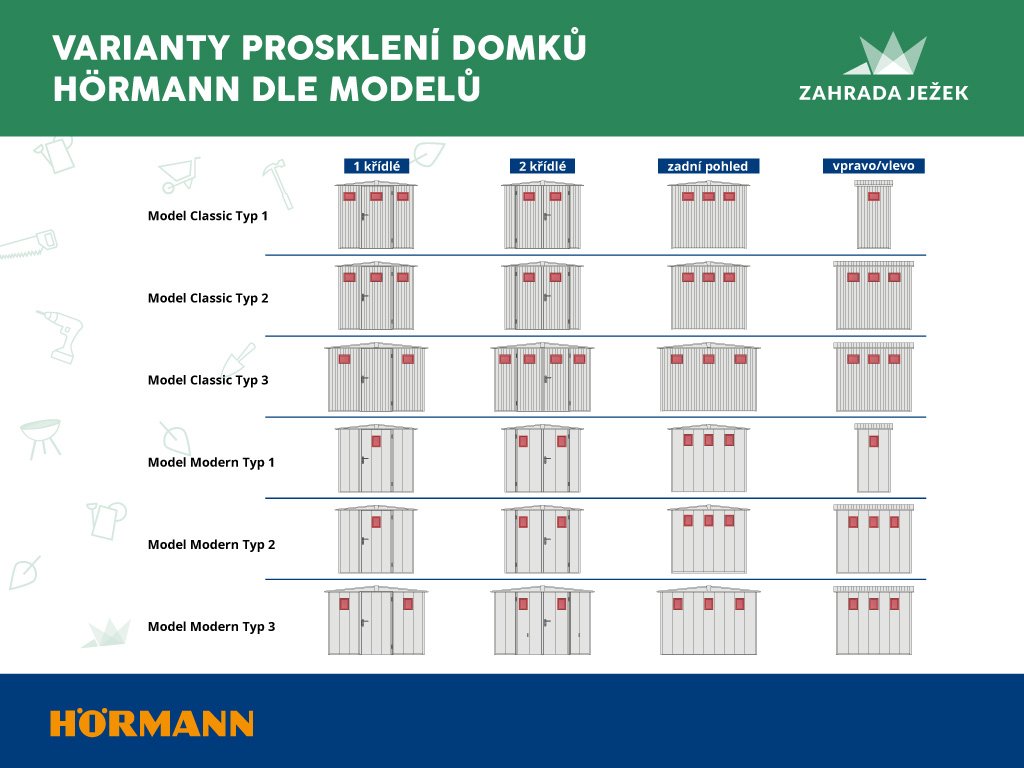 - Domek přesně podle vašich představ - můžete zvolit libovolnou barvu domku (9 základních barev domku zdarma), ze 3 velikostí domku, otevírání vlevo/vpravo, jednokřídlé nebo dvoukřídlé dveře, vlastní typ madla dveří, umístění okna na každou stěnu domku
