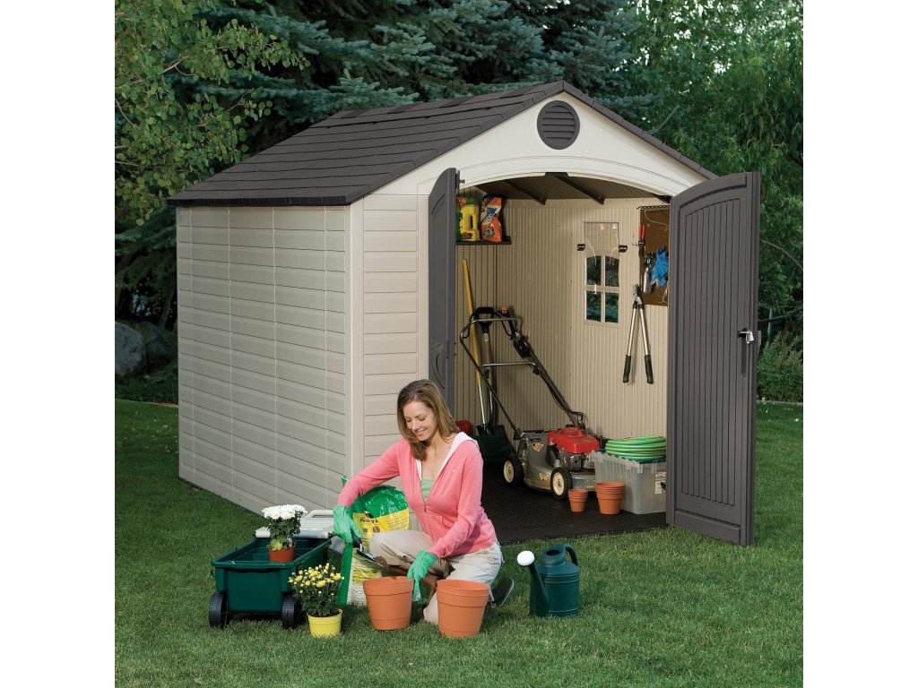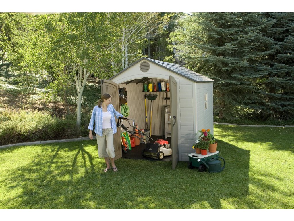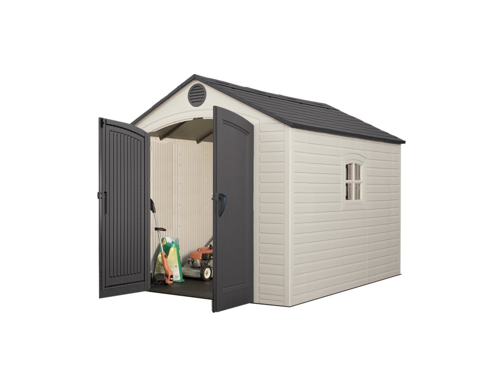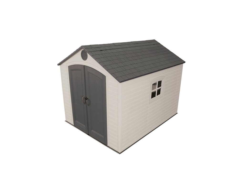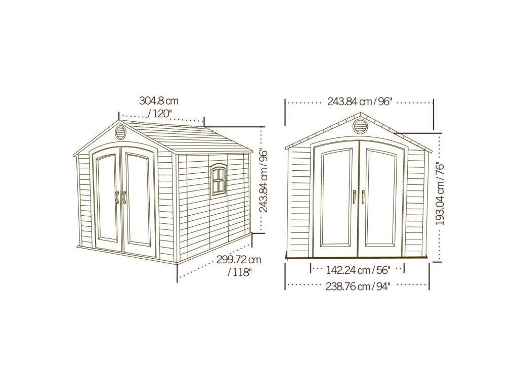 Zahradní domek na nářadí Lifetime CLASSIC Line v barevné kombinaci světlá/tmavá šedá se hodí k celoročnímu uskladnění nářadí, sekaček, nábytku a dalšího zahradního vybavení. Domek má rozměry 244 x 305 cm (přední strana s dveřmi x hloubka) a celkovou výšku 2,4 m. Zastavěná plocha činí 7,4 m2.