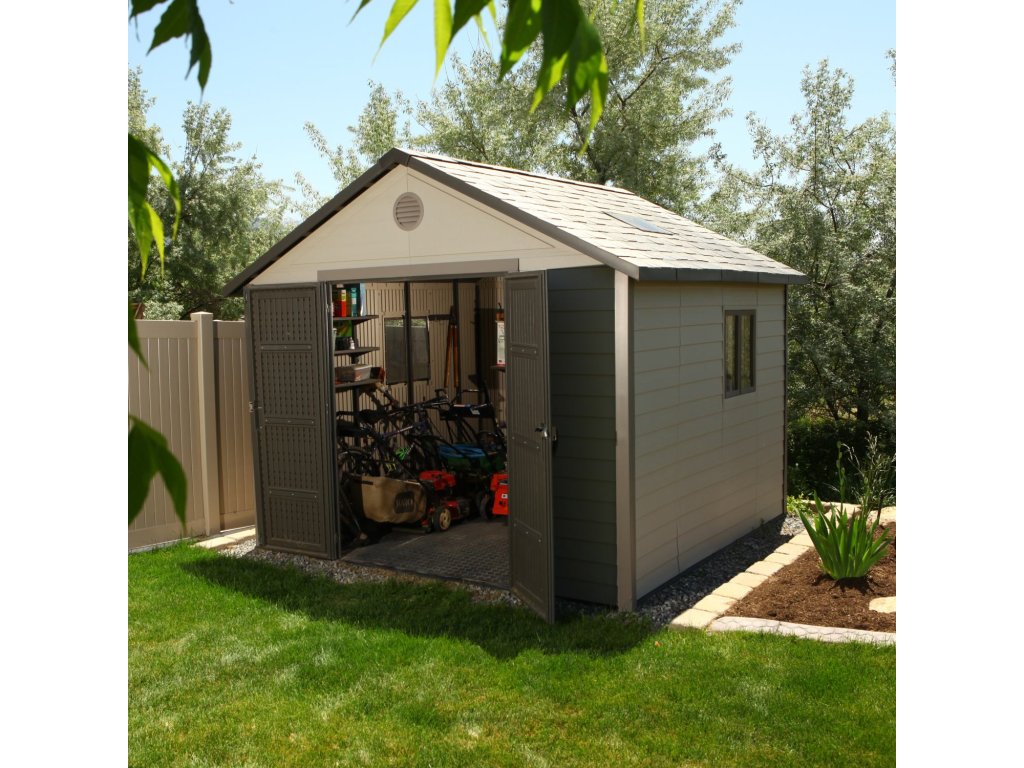 Prostorný zahradní domek na nářadí Lifetime KING SIZE v barevné kombinaci světlá/tmavá šedá se hodí k celoročnímu uskladnění nářadí, sekaček, nábytku a dalšího zahradního vybavení. Domek má rozměry 337 x 337 cm (přední strana s dveřmi x hloubka) a celkovou výšku 2,8 m. Zastavěná plocha činí 11,4 m2.