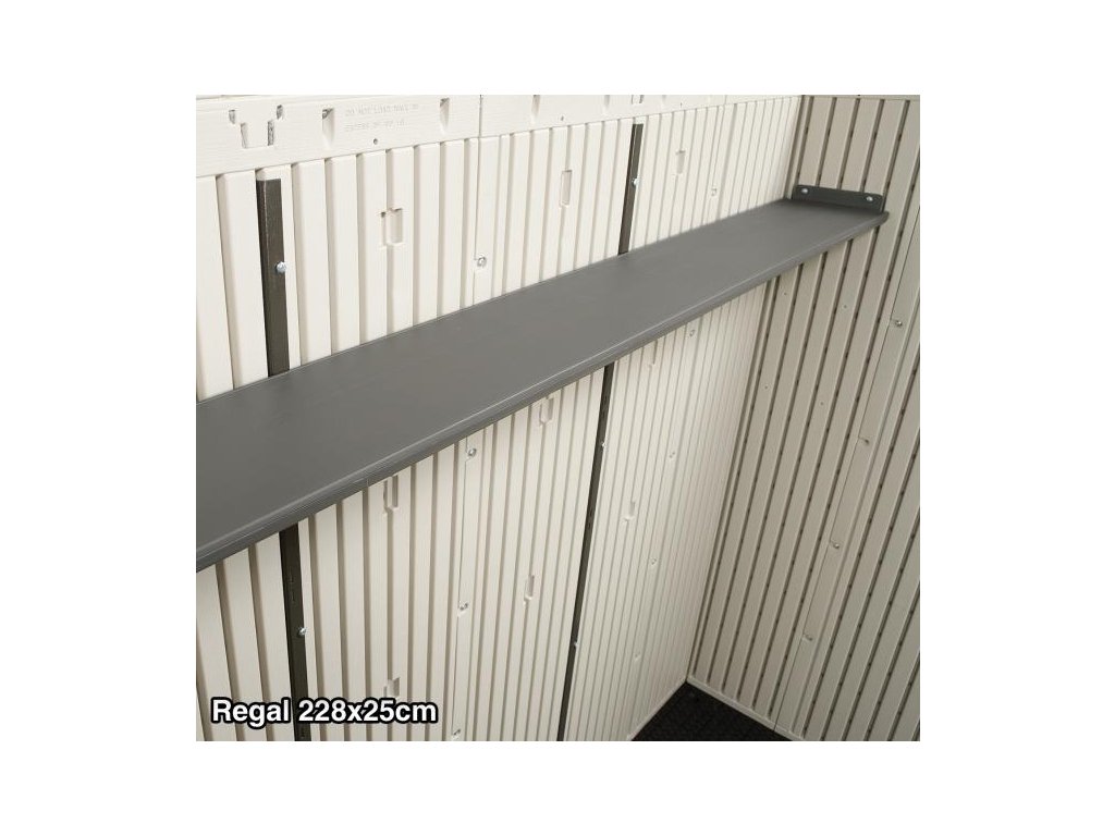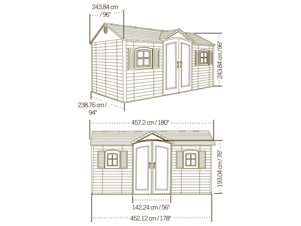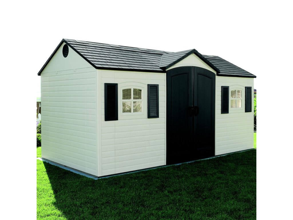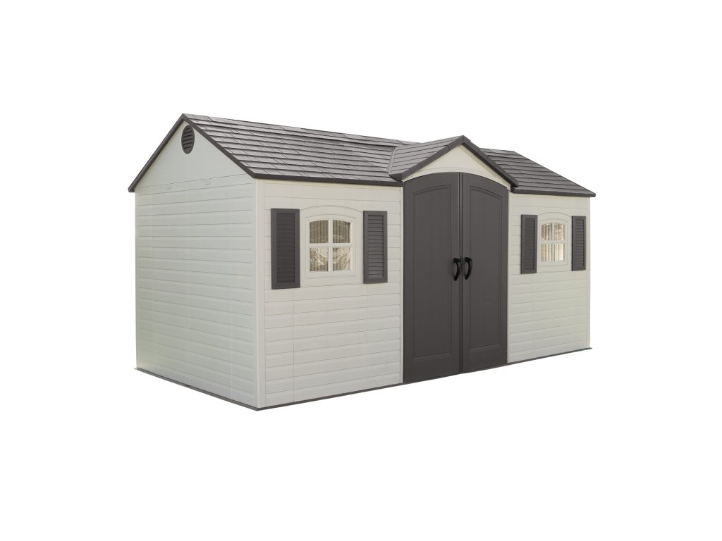 Prostorný zahradní domek na nářadí Lifetime GARTEN VILLA v barevné kombinaci světlá/tmavá šedá se hodí k celoročnímu uskladnění nářadí, sekaček, nábytku a dalšího zahradního vybavení. Domek má rozměry 457 x 244 cm (přední strana s dveřmi x hloubka) a celkovou výšku 2,4 m. Zastavěná plocha činí 11,2 m2.