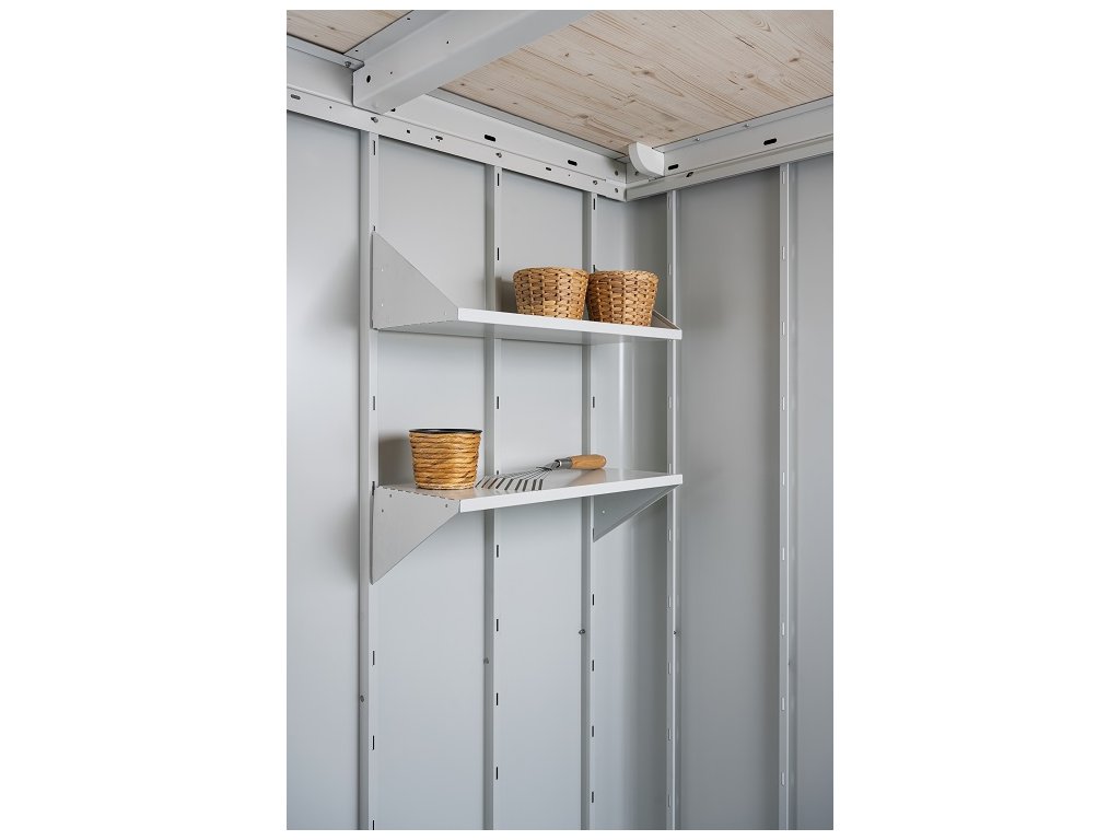 Domek je dále vybaven 3-cestným uzamykacím mechanismem s klikou dveří z nerezové oceli, takže si můžete být jisti, že vaše věci jsou v bezpečí. Jeho robustní střešní konstrukce navíc zvládne sněhové zatížení až 150 kg/m² a je odolná vůči bouřím.
