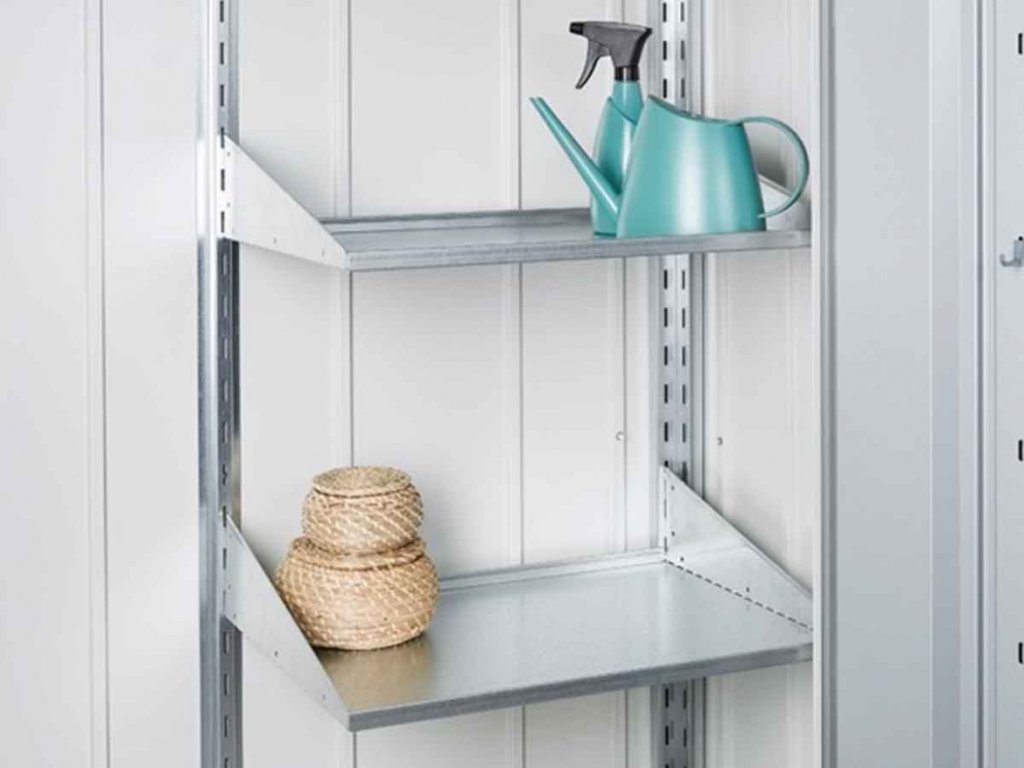 Sada polic a regálových stojen změní váš zahradní domek Biohort na přehledný sklad. Police jsou individuálně polohovatelné. Hloubka police je 43,5 cm. Šířka police je 72 cm. Policová sada je žárově pozinkovaná, aby byla zajištěna dlouhá životnost. Snadno se instaluje a vydrží zatížení až 15 kg na polici. Pro všechny, kteří potřebují uložitmíň věcí, nabízíme polici s hloubkou 24,5 cm, kterou si můžete dokoupit v bohaté nabídce volitelného příslušenství.