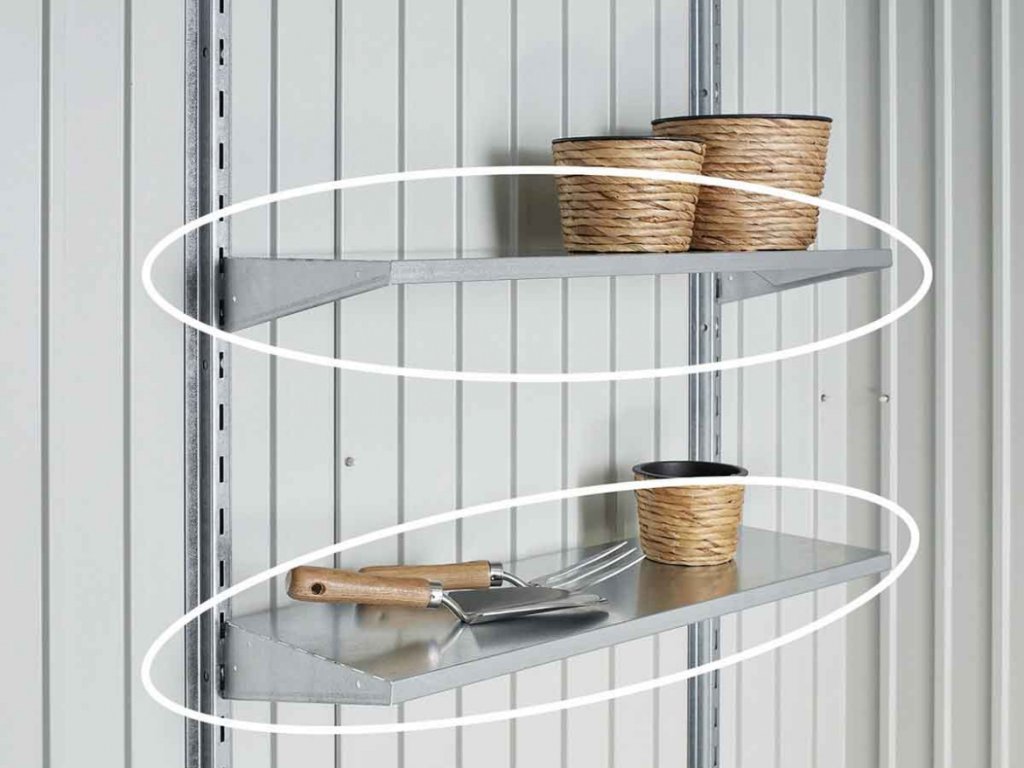 Sada polic a regálových stojen změní váš zahradní domek Biohort na přehledný sklad. Police jsou individuálně polohovatelné. Standardní hloubka je 24,5 cm a šířka police je 72 cm (Biohort standard). Policová sada je žárově pozinkovaná, aby byla zajištěna dlouhá životnost. Snadno se instaluje a vydrží zatížení až 15 kg na polici. Pro všechny, kteří potřebují uložit mnohem více věcí, nabízíme polici s hloubkou 43,5 cm, kterou si můžete dokoupit v bohaté nabídce volitelného příslušenství.