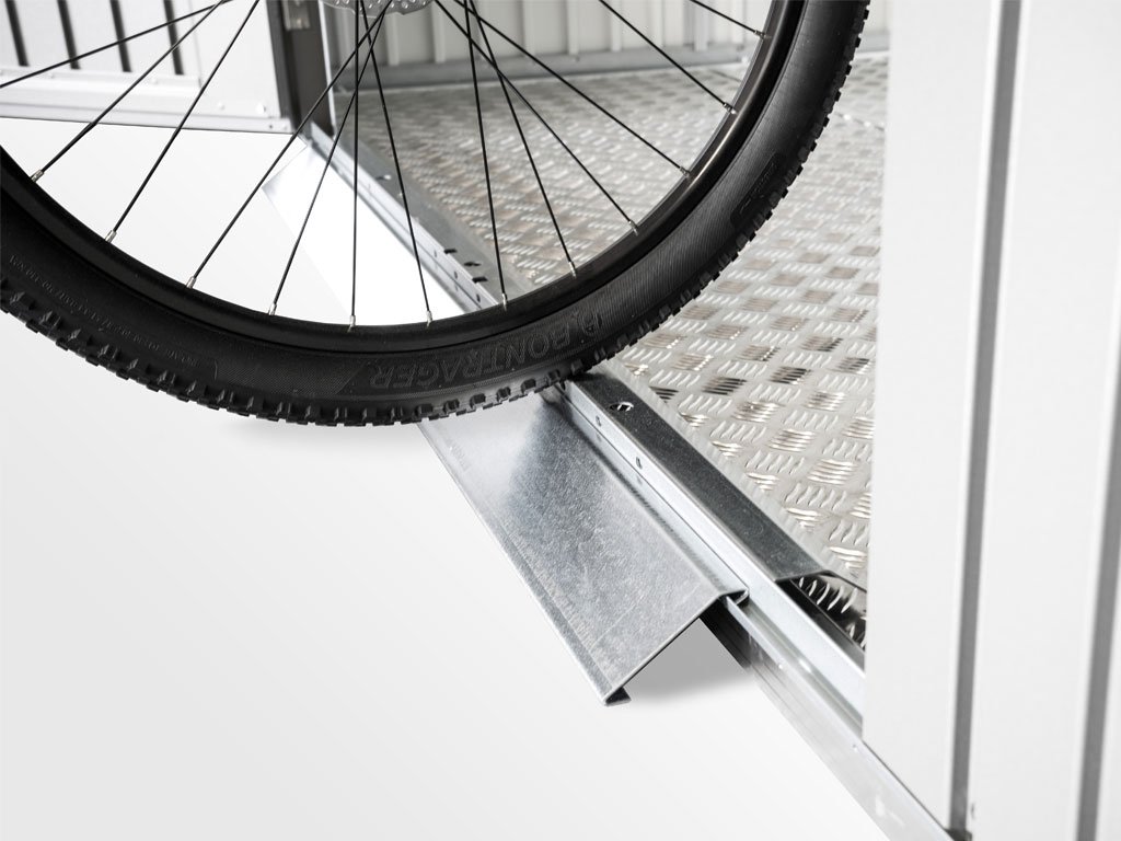 Nájezdová rampa pro pohodlné přejíždění podlahového prahu domku těžkými stroji. Skládá se ze dvou lišt z vysoce kvalitní žárově zinkované oceli. které vytvářejí pevný spoj s nosností až 200 kg. Rampu je možné použít pouze v kombinaci hliníkového podlahového rámu spolu s dvoukřídlími dveřmi.