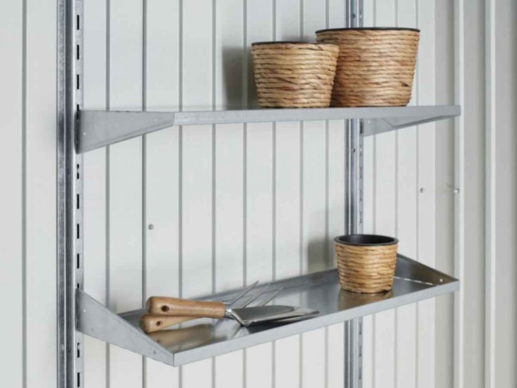 Sada dvou stabilních regálových stojin pro zahradní domek Europa a Skříň na nářadí Gareteschrank. Vyrobeny jsou ze žárově zinkovaného HUT profilu s otvory pro kompletní instalaci regálových polic, závěsného koše, sklápěcího stolu a háčků.