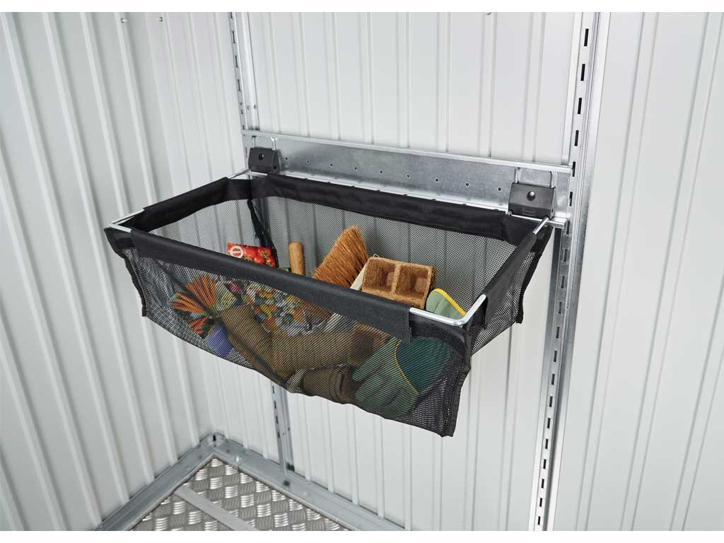 Závěsný koš pro zahradní domky Biohort je ideální volbou k uskladnění drobných dílů a zahradního náčiní. Balení obsahuje lištu na zeď pro zavěšení do regálových stojin a koš z černé polyesterové tkaniny.