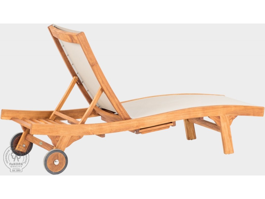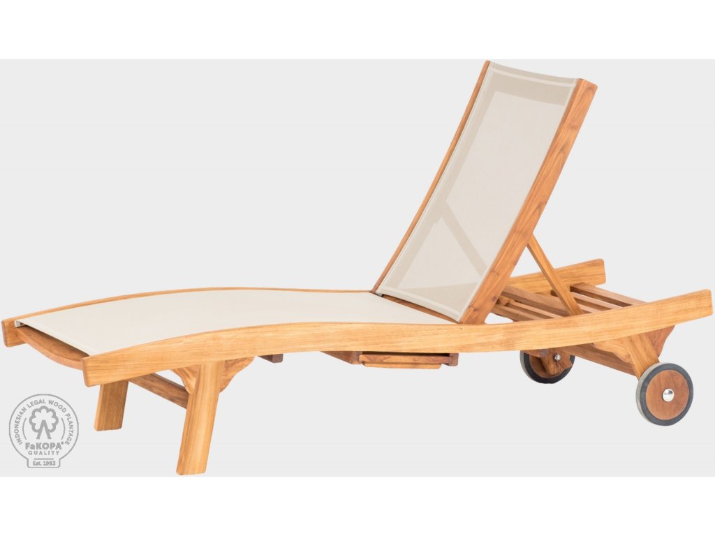 Zahradní lehátko s kolečky Elisa s Batyline výpletem o rozměru 200 x 65 cm a výšce 40 cm vám nabídne maximální komfort. Sklopná opora zad se dá snadno nastavit dle potřeby do několika poloh. Velmi praktický je i výsuvný stoleček. Výplet z Batyline tkaniny zajistí pohodlné ležení. Betyline tkanina je výjimečná, velice pevná, tvarově stálá technická tkanina, která neabsorbuje okolní teplotu či vlhkost a odolává UV záření. Lehátko je ošetřeno teakovým olejem.