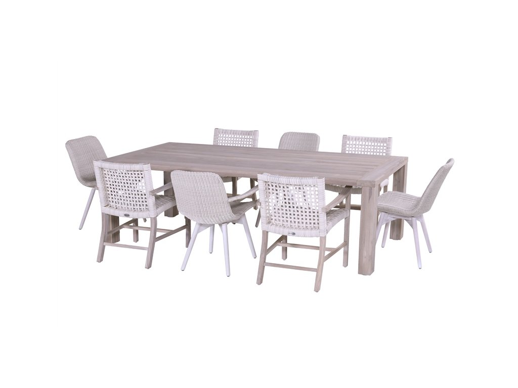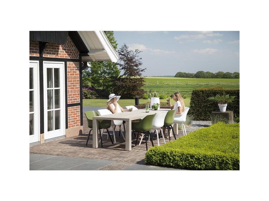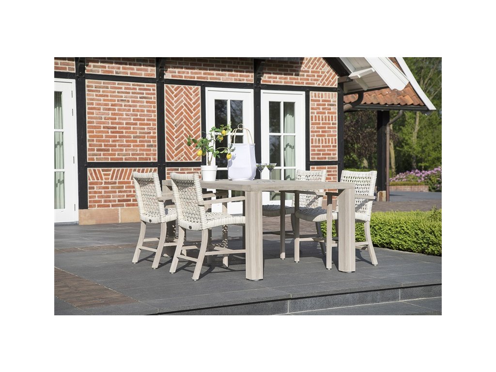 Stůl je vyroben z teakového dřeva a je neuvěřitelně bytelný a odolný. Teak má lehce našedlou barvou, která je pro něj přirozená a v průběhu času ještě lehce zesvětlá. Pokud chcete udržet stejnou barvu dřeva, můžete stůl ošetřit nátěrem. Tento materiály je také velmi odolný vůči různým povětrnostním vlivům a nepřízni počasí. Díky tomu může stůl zůstat venku po celý rok.