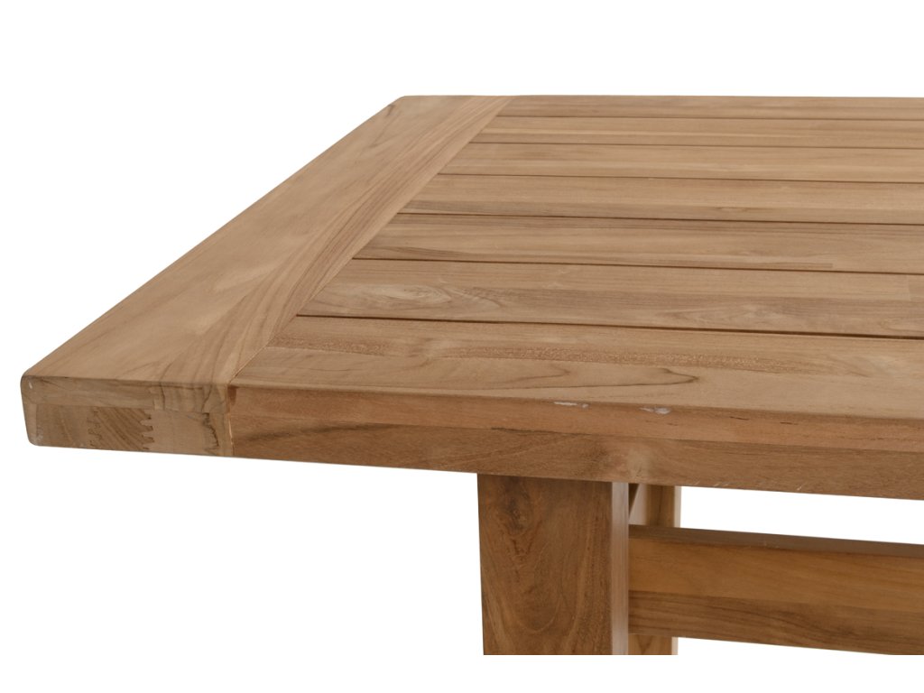 Stůl je vyroben z teakového dřeva a je neuvěřitelně bytelný a odolný. Teak má lehce našedlou barvou, která je pro něj přirozená a v průběhu času ještě lehce zesvětlá. Pokud chcete udržet stejnou barvu dřeva, můžete stůl ošetřit nátěrem. Tento materiály je také velmi odolný vůči různým povětrnostním vlivům a nepřízni počasí. Díky tomu může stůl zůstat venku po celý rok.