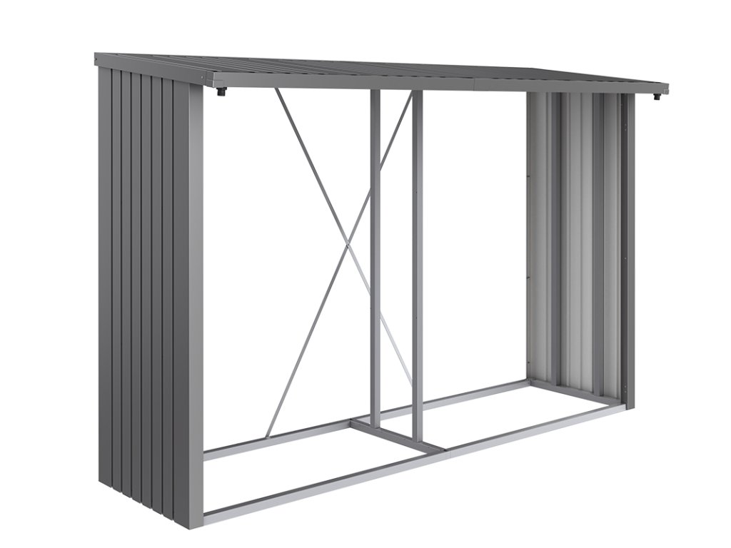 Konstrukci stěn tvoří žárově pozinkovaný ocelový plech o síle 0,5 mm, potažený polyamidovým vypalovacím lakem, šrouby jsou z nerezové oceli. Vysokou boční stabilitu zajišťuje pevný rámu z hliníkových trubek (40 x 40 mm), vydrží vysoké zatížení sněhem. Integrovaný okapový žlab na přední části střechy. Do přístřešku se pohodlně vejde jedna řada velkých polen, anebo dvě řady menších polínek (max. 35 cm dlouhých).