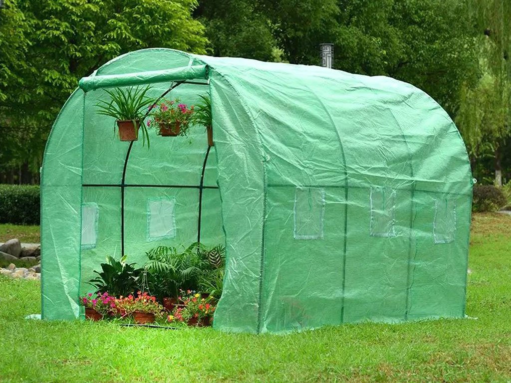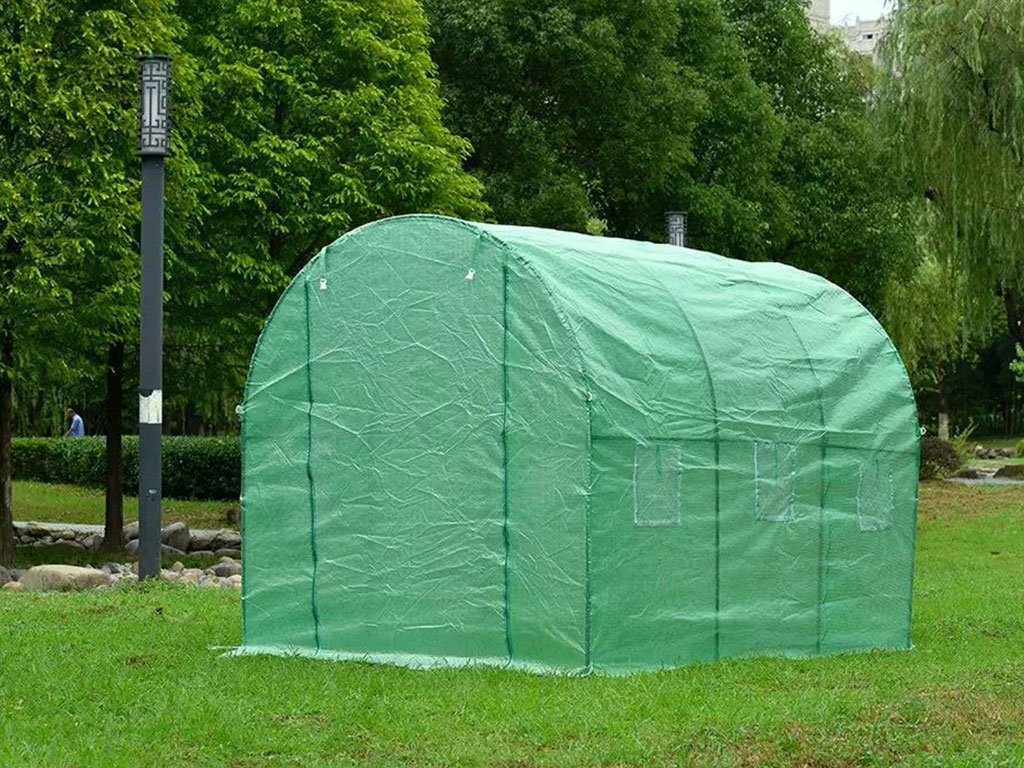 Fóliovník pro pěstování rostlin, zelená fólie s propustností 140g/m2, skleněná vlákna / polyethylen / kov, konstrukční tyče o průměru 25mm, 6 odvětrávacích okének na bocích, rozloha fóliovníku 6 m2, rozměry 300x200x200 cm.